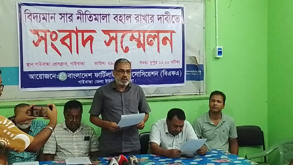 বিদ্যমান সার নীতিমালা বহাল রাখার দাবিতে আজ মঙ্গলবার দুপুর ১২টায় গাইবান্ধা প্রেসক্লাবে এক সংবাদ সম্মেলন অনুষ্ঠিত হয়েছে। সংবাদ সম্মেলনের আয়োজন করে বাংলাদেশ ফার্টিলাইজার এসোসিয়েশন (বিএফএ) গাইবান্ধা জেলা ইউনিট।